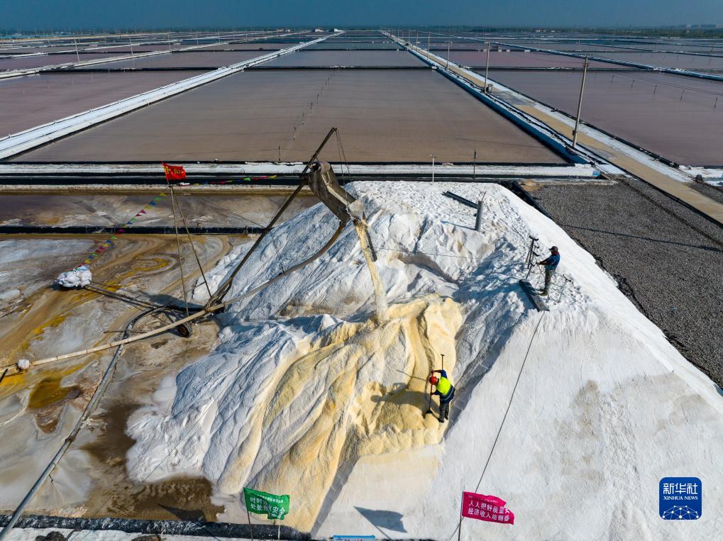 9月7日,在江蘇省鹽城市響水縣,工人在江蘇省銀寶鹽業(yè)有限公司的鹽田里扒鹽(無(wú)人機照片)。