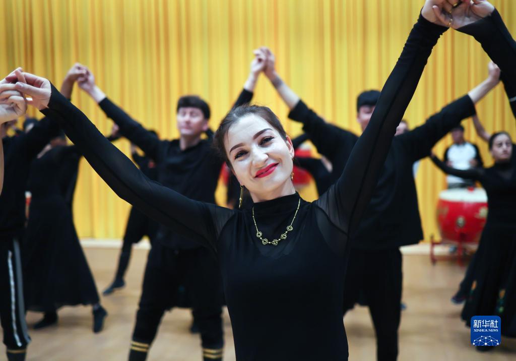 古麗巴努爾·庫爾恰克(前)和同事們一起排練鷹舞節目《傳承》(9月4日攝)。