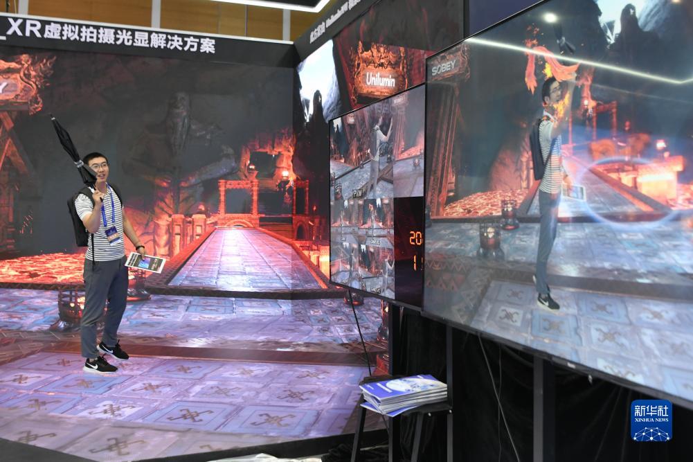9月7日,在“2023世界顯示產(chǎn)業(yè)大會(huì )新型顯示創(chuàng )新成果展”現場(chǎng),觀(guān)眾體驗XR虛擬拍攝系統。