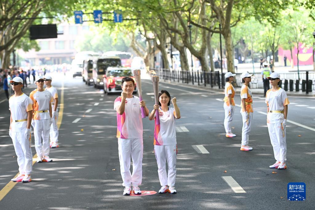 9月8日,火炬手徐川子(右)與鐘毅在火炬傳遞中。