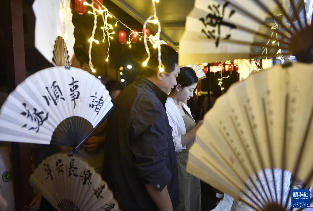 9月7日晚,游人在安陽(yáng)古城倉巷街“古韻鎏光·燈火安陽(yáng)”沉浸式夜游活動(dòng)現場(chǎng)選購商品。