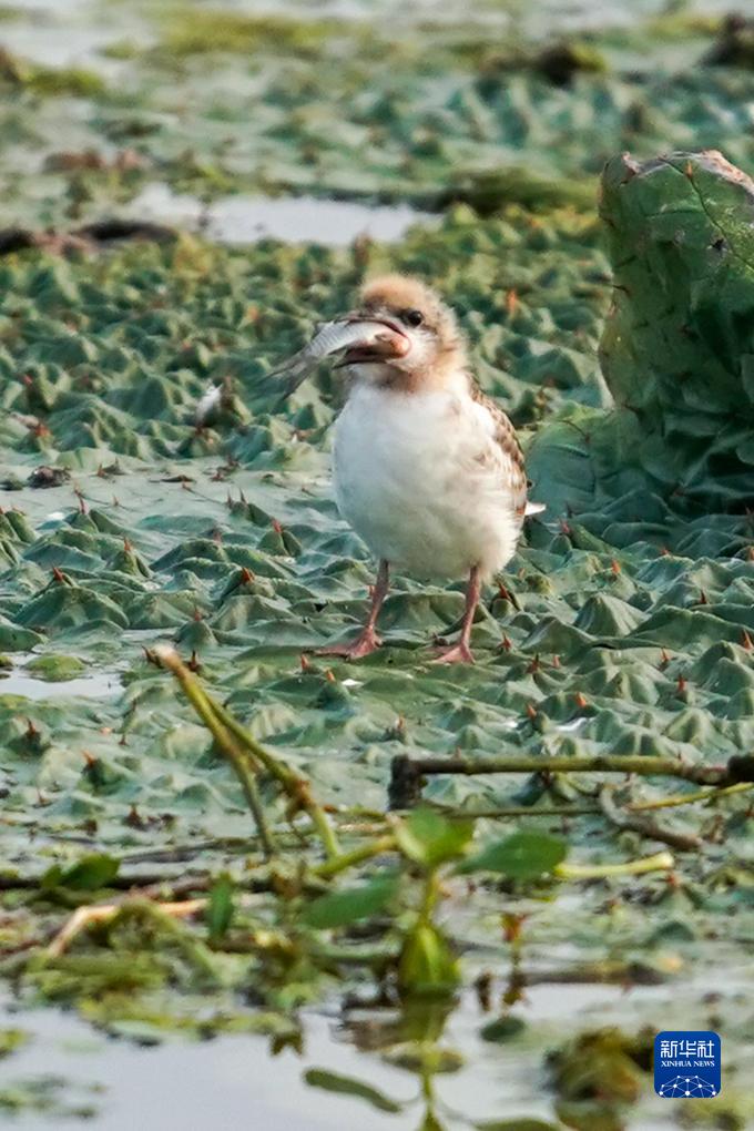 在江蘇省鹽城市建湖縣九龍口國家濕地公園內,須浮鷗幼鳥(niǎo)在進(jìn)食(9月7日攝)。