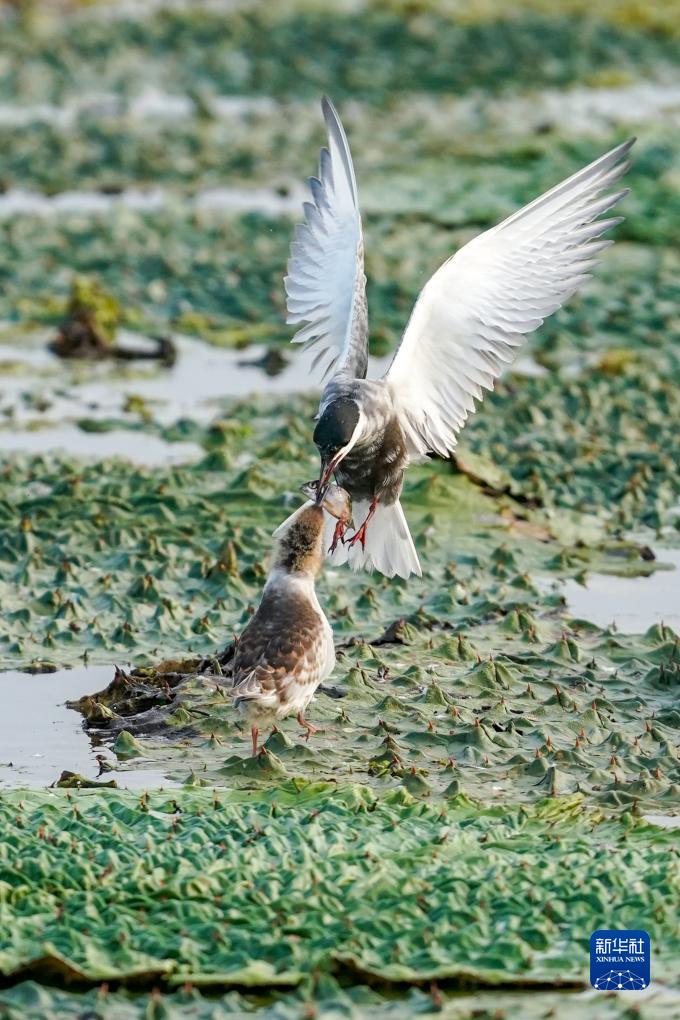 在江蘇省鹽城市建湖縣九龍口國家濕地公園內,須浮鷗銜著(zhù)小魚(yú)給幼鳥(niǎo)喂食(9月7日攝)。