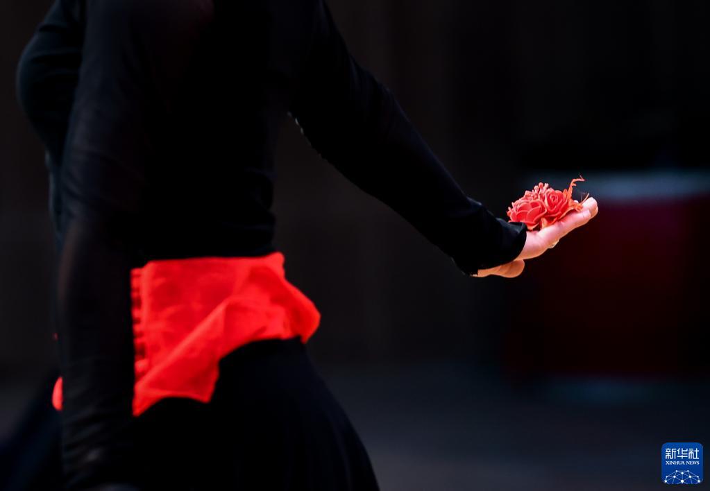 新疆塔縣文工團舞蹈演員古麗巴努爾·庫爾恰克(右)在排練《花兒為什么這樣紅》(9月4日攝)。新華社記者 蘭紅光 攝