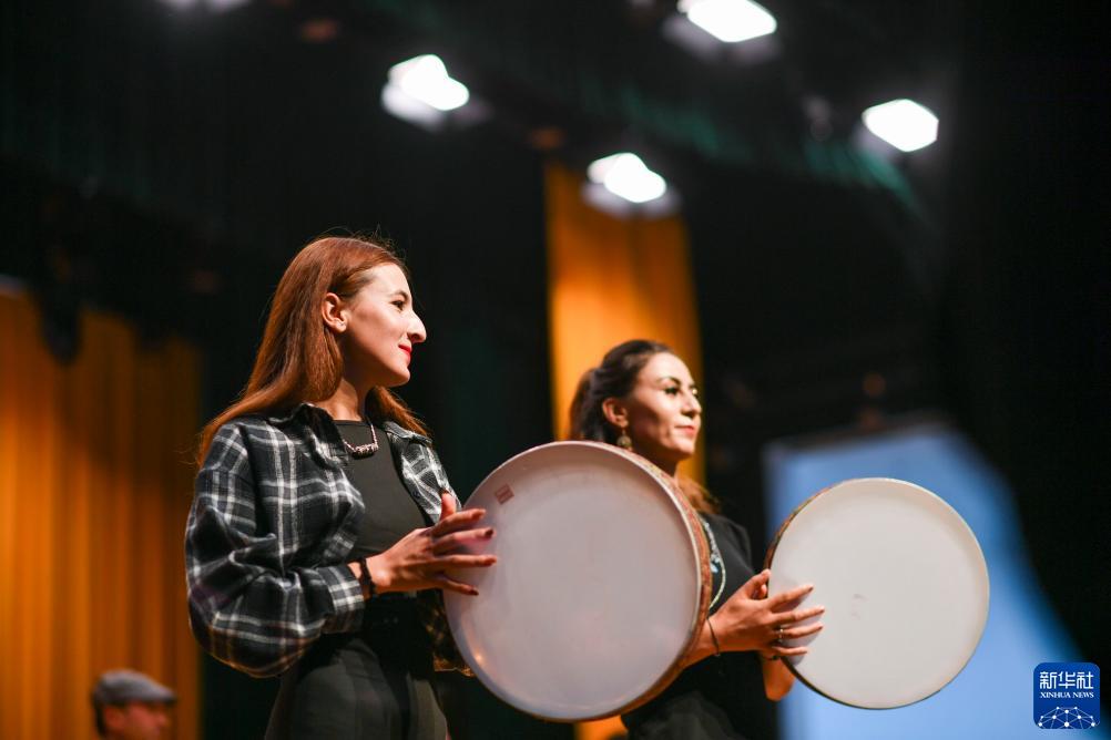 新疆塔縣文工團樂(lè )手美麗卡·依沙克(左)和同伴在排練時(shí)打手鼓(9月4日攝)。新華社記者 胡虎虎 攝