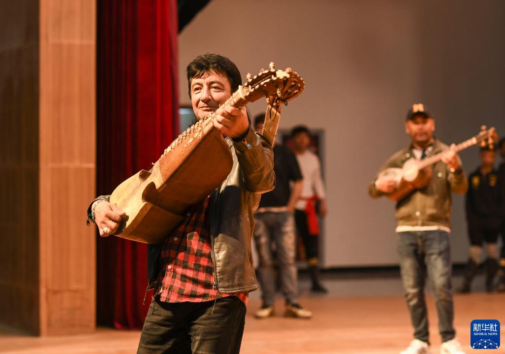 塔縣文化館館長(cháng)艾孜木·胡西迪力(前)和樂(lè )手們排練(9月7日攝)。新華社記者 胡虎虎 攝