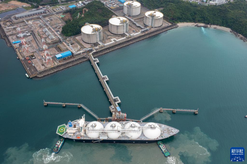 9月7日,搭載著(zhù)來(lái)自澳大利亞的6.5萬(wàn)噸進(jìn)口LNG的“能量自信”號運輸船泊入廣東大鵬液化天然氣(LNG)接收站(無(wú)人機照片)。