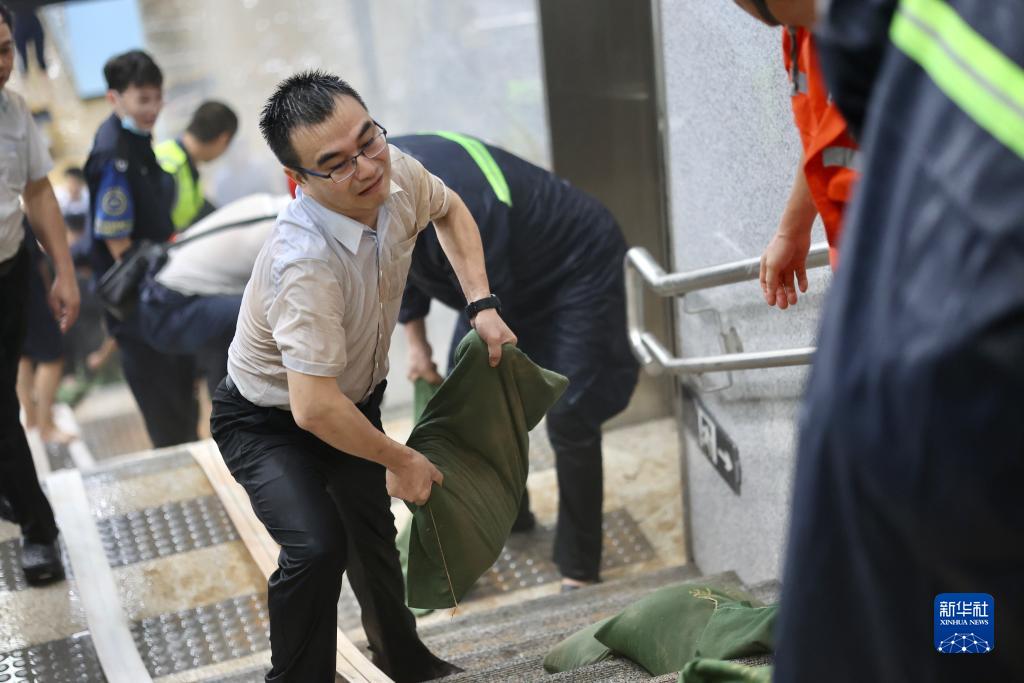 9月7日,在位于深圳市龍崗區的深圳地鐵16號線(xiàn)黃閣坑站,工作人員接力搬運沙袋。