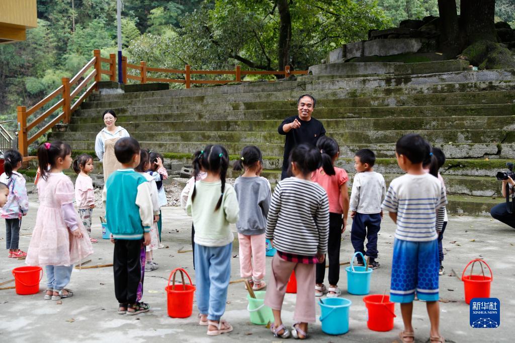 在烏英苗寨教學(xué)點(diǎn),潘先鋒(后排右)和同事在教新生學(xué)習排隊(2023年8月30日攝)。