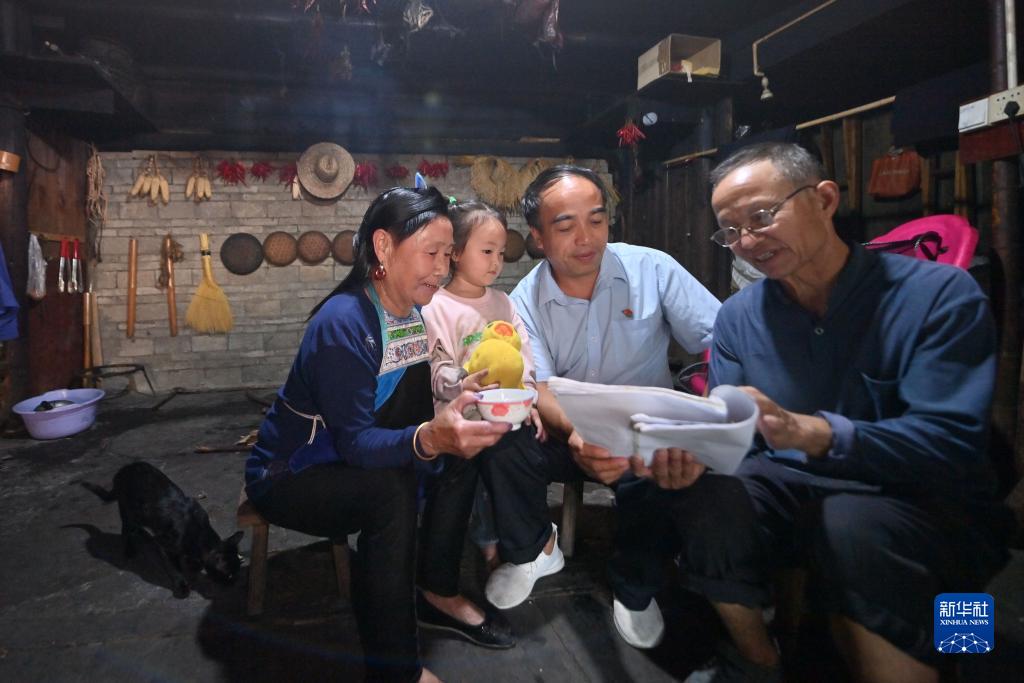 在烏英苗寨,潘先鋒(右二)和村民梁安合(右一)在修改夜校課程教材(2023年9月7日攝)。