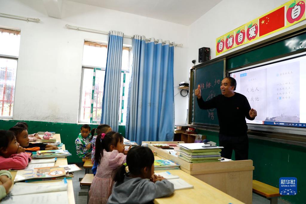 在烏英苗寨教學(xué)點(diǎn),潘先鋒在教室里上課(2023年8月30日攝)。