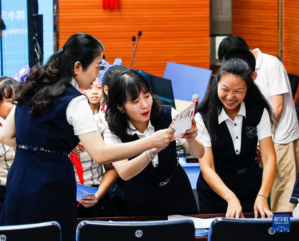 9月8日,南寧市濱湖路小學(xué)的教師翻看學(xué)生們送上的手繪獎狀。