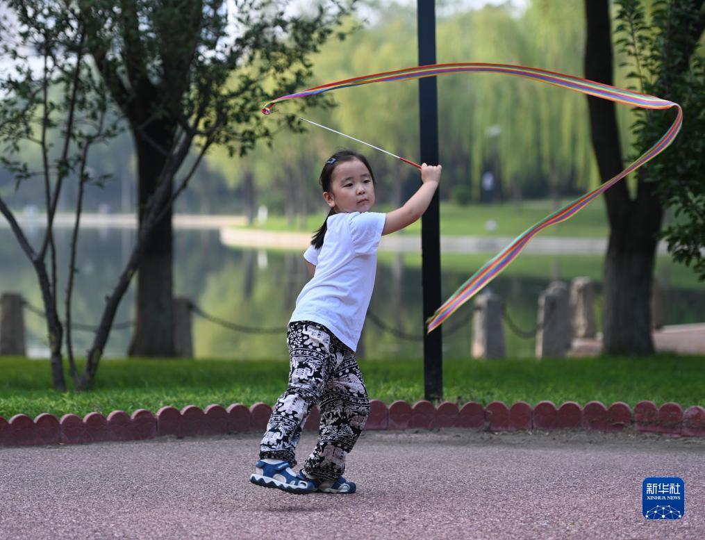 9月7日,小朋友在德州市行政中心綠地揮舞彩帶。