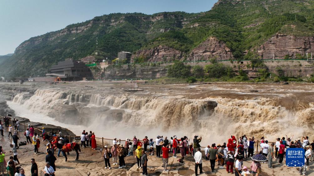 9月8日,游客在黃河壺口瀑布景區游覽(無(wú)人機照片)。
