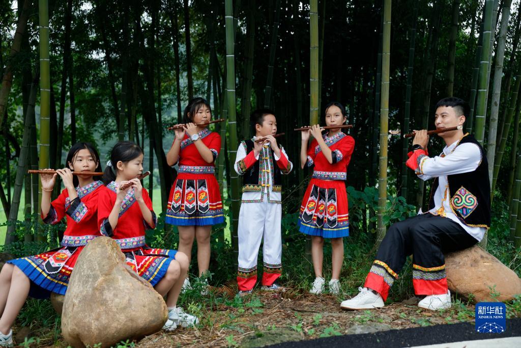 肖惠文帶著(zhù)竹笛班的孩子們在竹林里吹奏(9月5日攝)。