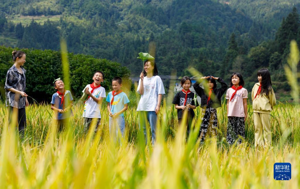 9月7日,在通道縣獨坡鎮上巖村,已畢業(yè)一年多的“定向師范生”吳玉卓(左一)、楊海琪(中)帶學(xué)生來(lái)到稻田邊開(kāi)展課外實(shí)踐活動(dòng)。