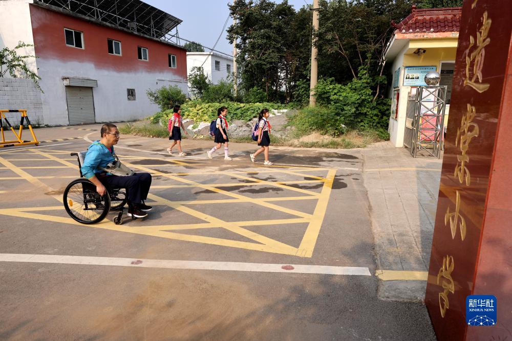 9月4日,在山東省棗莊市永安鎮遺棠小學(xué)門(mén)口,楊季剛劃著(zhù)輪椅進(jìn)入校園。