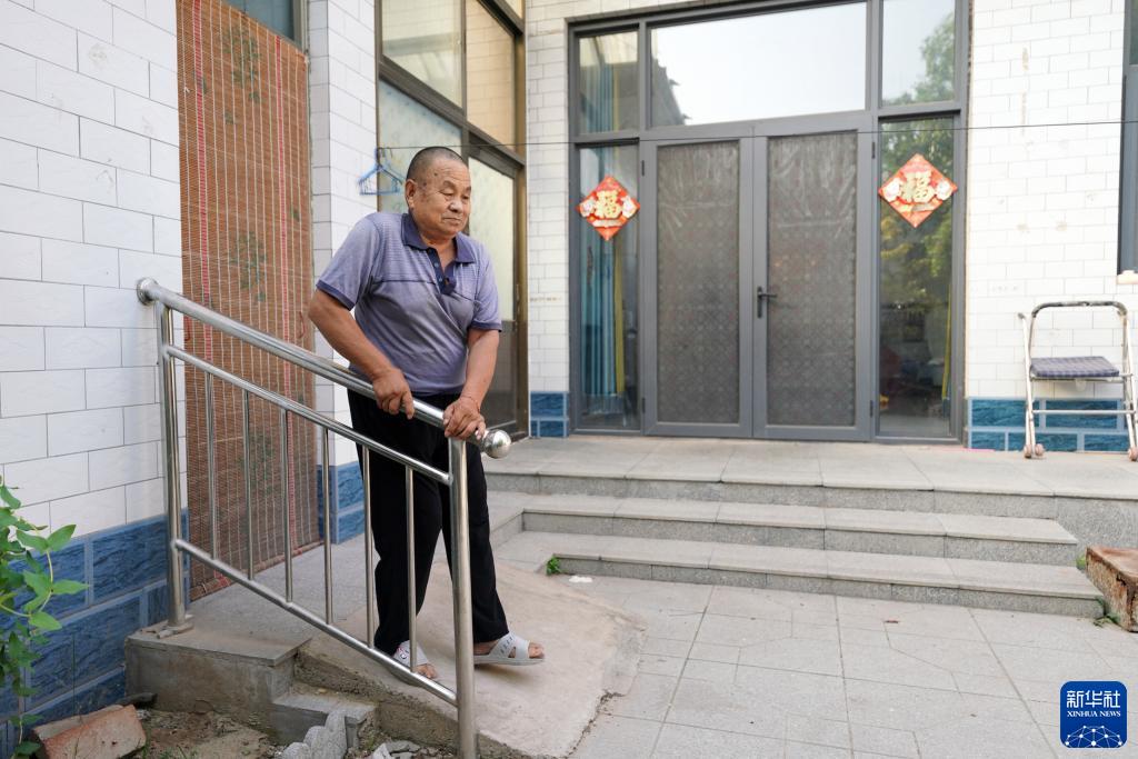 9月8日,河北省巨鹿縣白寨村78歲的張廷軍扶著(zhù)適老化改造工程安裝的扶手走出屋門(mén)。
