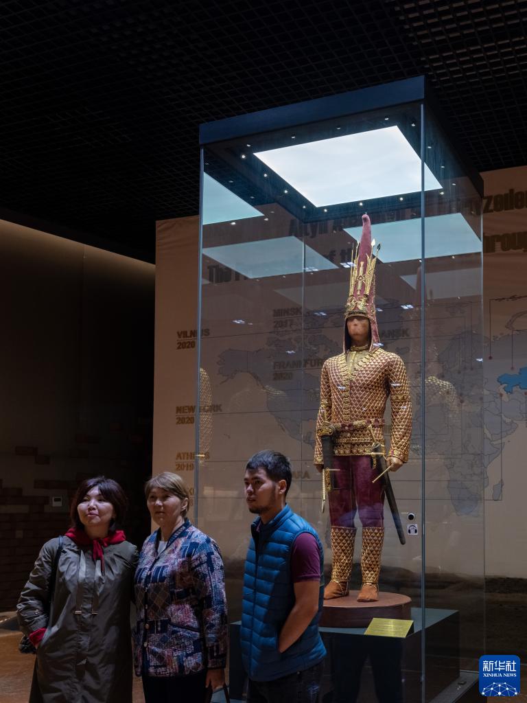 9月8日,在哈薩克斯坦首都阿斯塔納的哈薩克斯坦國家博物館,人們參觀(guān)伊塞克金人墓出土的服飾及武器復原展示。