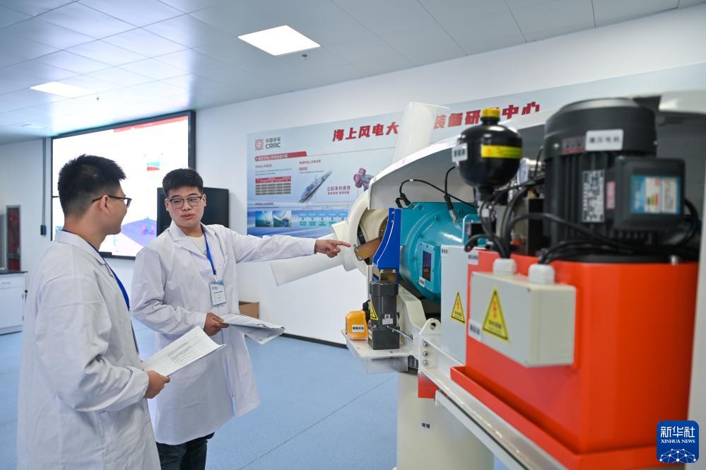 工作人員在江蘇省鹽城市射陽(yáng)港低(零)碳產(chǎn)業(yè)園中車(chē)海上風(fēng)電大功率裝備研發(fā)中心記錄風(fēng)電機組縮比控制綜合實(shí)驗系統數據(9月8日攝)。