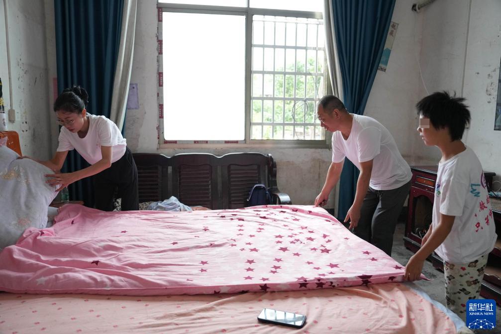 9月7日,陳艷輝(左)和陳二文(中)在湖南省株洲市茶陵縣界首鎮大新村的小美家中帶小美做家務(wù)。小美先天智力障礙,陳艷輝和陳二文教她生活常識,小美基本學(xué)會(huì )了掃地、洗衣、做飯。新華社記者 薛宇舸 攝