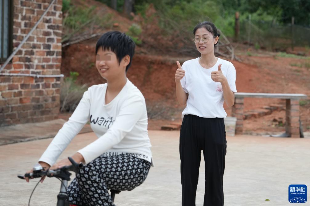 9月7日,陳艷輝(右)在湖南省株洲市茶陵縣界首鎮賀鋪村的小靜家中帶小靜騎單車(chē)。小靜先天智力障礙,對運動(dòng)十分感興趣,陳艷輝和陳二文常帶她跳繩、騎單車(chē)。新華社記者 薛宇舸 攝