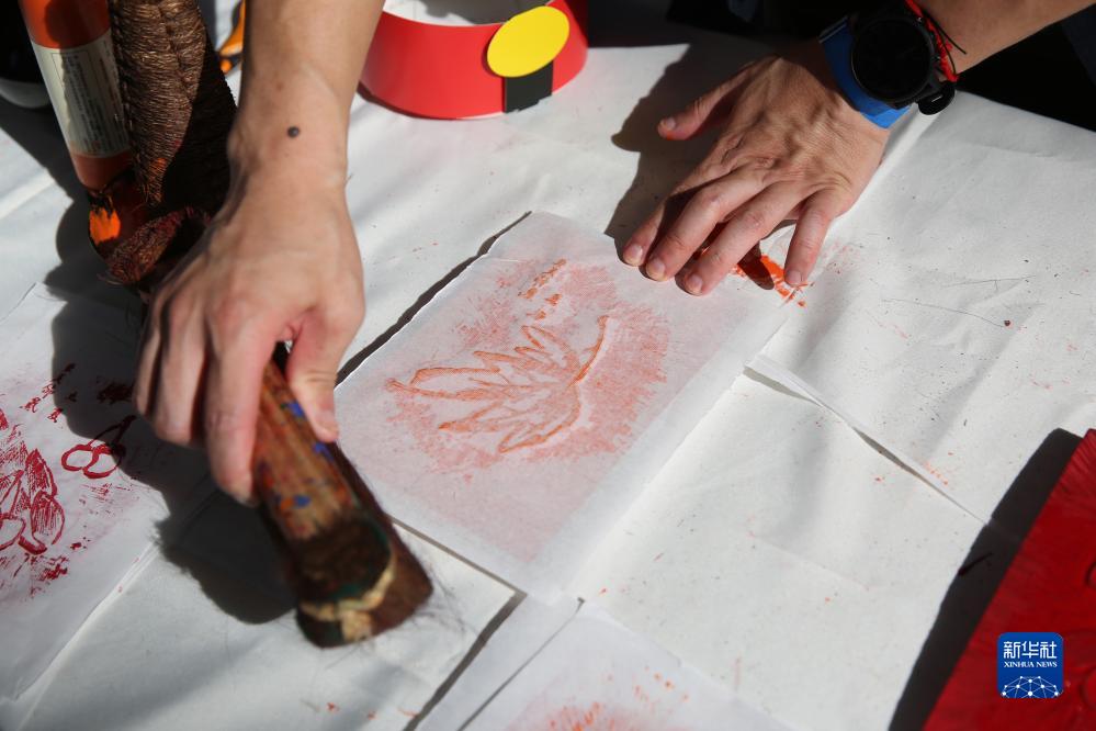 9月8日,參觀(guān)者在比利時(shí)布魯塞爾漫畫(huà)節中國館展區體驗木版水印。