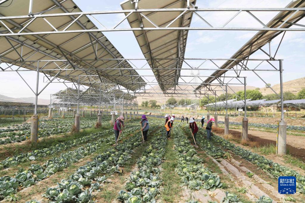 9月9日,農民在通渭縣榜羅鎮四新村光伏農業(yè)產(chǎn)業(yè)示范園的蔬菜地里勞作。