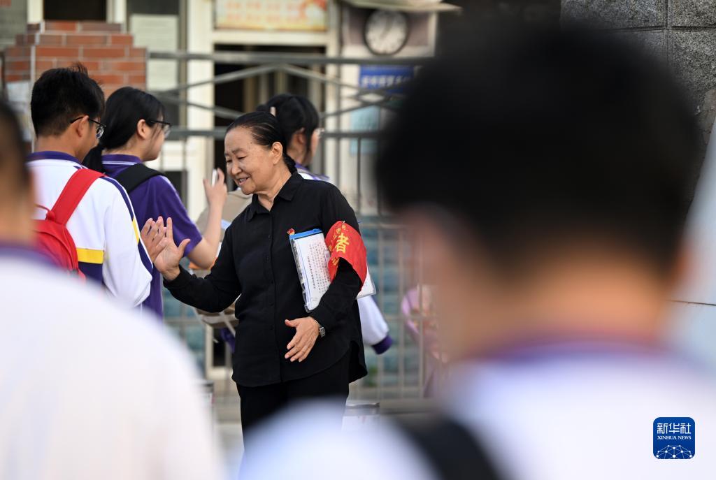 張慧穎在津英中學(xué)門(mén)口迎接學(xué)生入校(9月8日攝)。