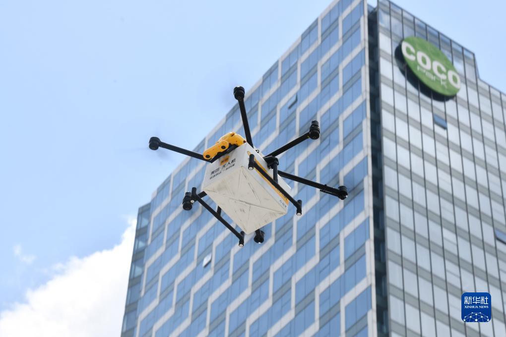 在深圳市龍崗區,一架送餐無(wú)人機穿行在高樓大廈間(8月15日攝)。