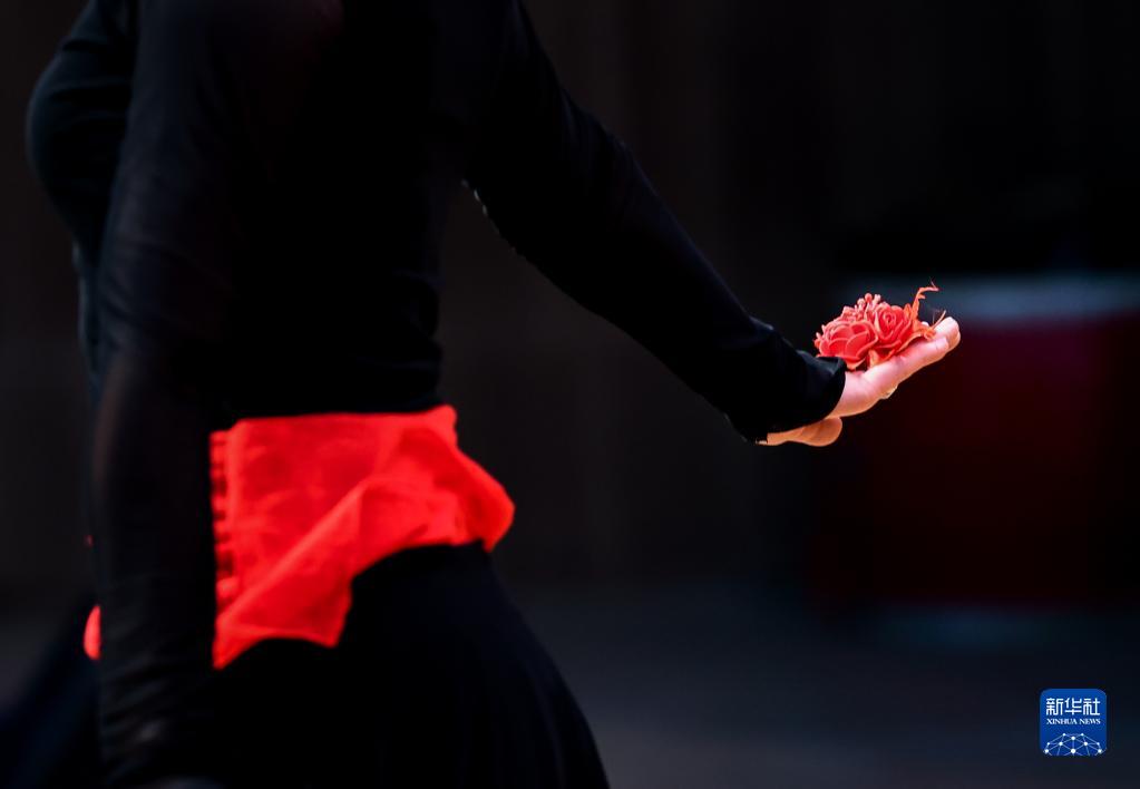 新疆塔縣文工團舞蹈演員古麗巴努爾·庫爾恰克在排練《花兒為什么這樣紅》(9月4日攝)。