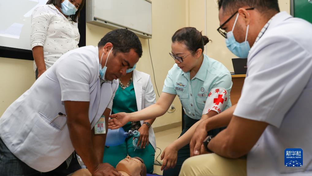 中國海軍“和平方舟”號醫院船在東帝汶訪(fǎng)問(wèn)期間,派出醫療專(zhuān)家分隊赴東帝汶國立醫院進(jìn)行ACLS培訓,文職醫護人員為國立醫院醫護人員進(jìn)行實(shí)操講解(9月5日攝)。