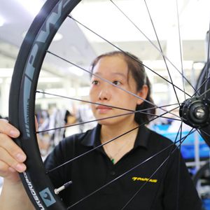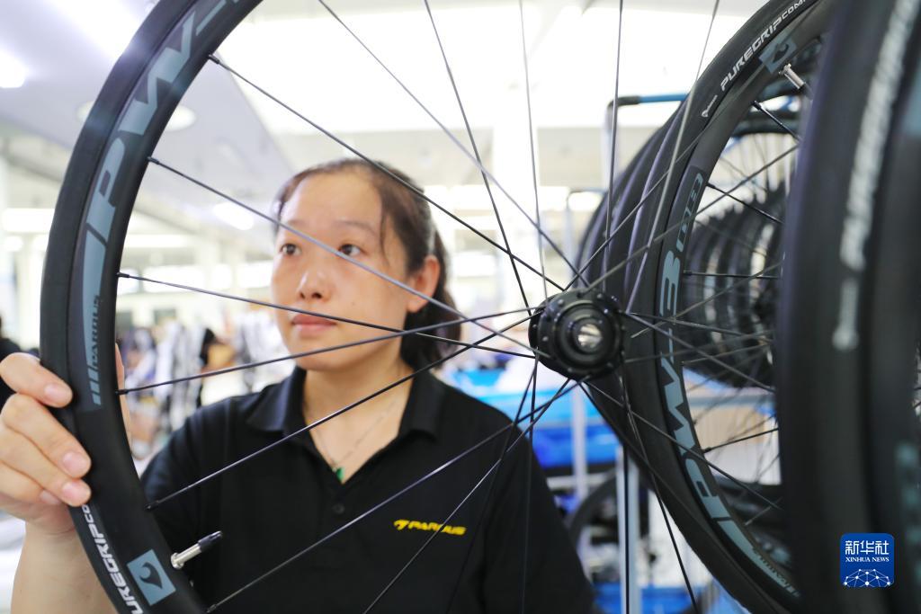 9月9日,在山東樂(lè )陵市一家企業(yè)的碳纖維自行車(chē)生產(chǎn)車(chē)間,工人在檢驗輪組。