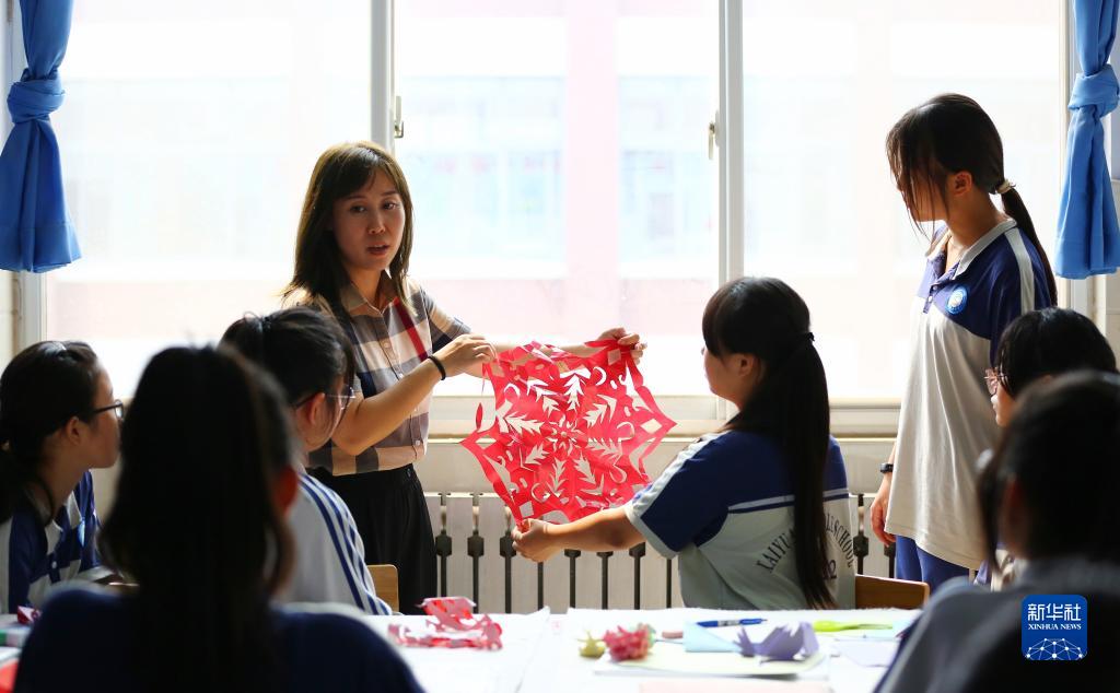 9月9日,在山東省樂(lè )陵市開(kāi)元中學(xué),老師指導學(xué)生學(xué)習剪紙。新華社發(fā)(李志軍 攝)