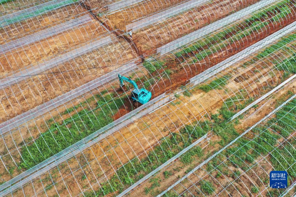 9月9日,工人在常寧市洋泉鎮巷坪村智慧育苗大棚施工現場(chǎng)施工(無(wú)人機照片)。
