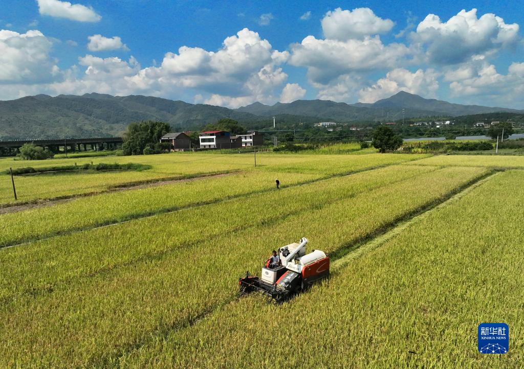 9月9日,在湖南省衡陽(yáng)市衡東縣楊林鎮,當地村民駕駛農機在收割水稻(無(wú)人機照片)。