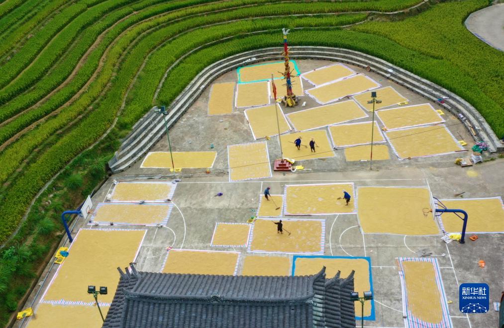 9月6日,村民在廣西融水苗族自治縣白云鄉高孝苗寨翻曬稻谷。