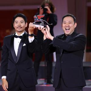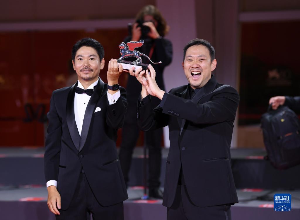 9月9日,在意大利威尼斯,獲得評審團大獎銀獅獎的電影《邪惡不存在》的導演濱口龍介(右)和演員大美賀均展示獎杯。