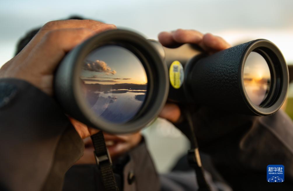 濕地生態(tài)管護員如科在四川省阿壩藏族羌族自治州若爾蓋縣花湖用望遠鏡觀(guān)察周邊環(huán)境(8月22日攝)。