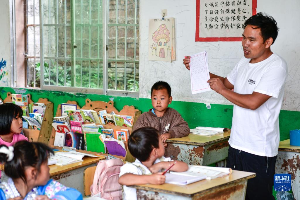 陸成文在寫(xiě)字課上展示一年級學(xué)生的書(shū)法作品(9月7日攝)。