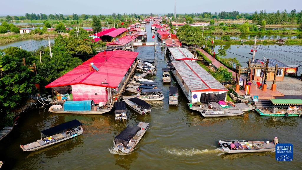 9月5日,在微山縣高樓鄉渭河小學(xué),放學(xué)后家長(cháng)劃船接孩子回家(無(wú)人機照片)。
