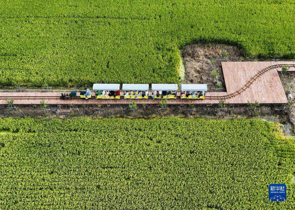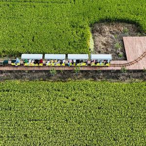 在宿遷市宿城區蔡集鎮牛角村歡樂(lè )田園度假區,游人乘坐“小火車(chē)”游覽田園風(fēng)光(9月9日攝,無(wú)人機照片)。