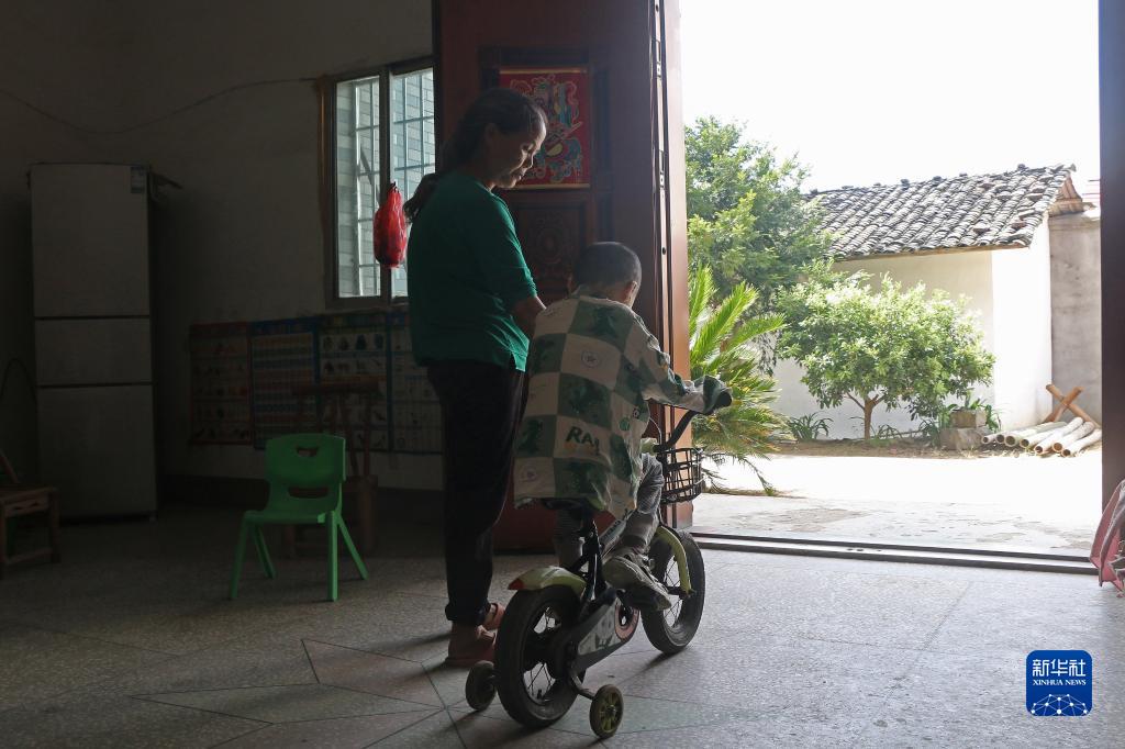 奶奶用小車(chē)推著(zhù)小澤出門(mén)上課(9月4日攝)。