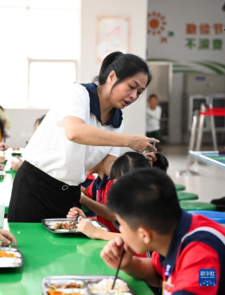 在海南(??冢┨厥饨逃龑W(xué)校,符堯惠在餐廳為學(xué)生系好頭發(fā)(9月6日攝)。
