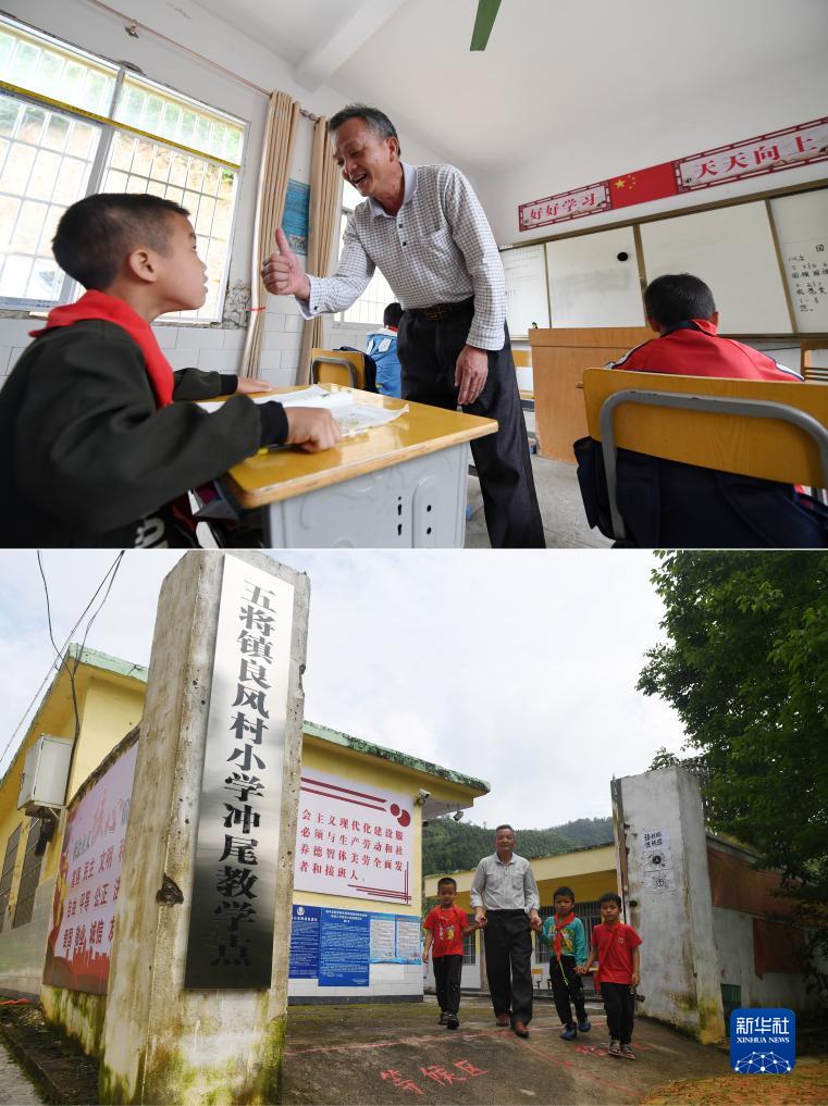 拼版照片:廣西賀州市昭平縣五將鎮良風(fēng)村小學(xué)沖尾教學(xué)點(diǎn)的龔壽新老師在課堂上表?yè)P學(xué)生(上圖),龔壽新老師領(lǐng)著(zhù)學(xué)生走出校門(mén)(下圖)(2022年5月25日攝)。龔壽新從1981年走上講臺至退休,42年時(shí)間一直堅守這所教學(xué)點(diǎn),曾獲得“賀州市優(yōu)秀共產(chǎn)黨員”榮譽(yù)稱(chēng)號。