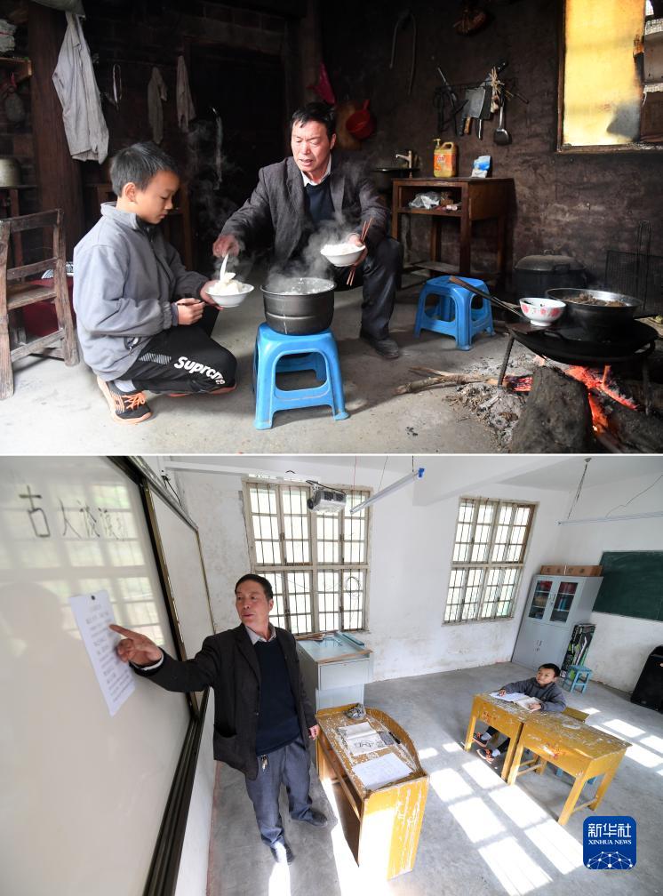 拼版照片:劉顯岳老師在廣西環(huán)江毛南族自治縣龍巖鄉朝閣村的家里給學(xué)生周雄打飯(上圖),朝閣小學(xué)的劉顯岳老師給學(xué)生周雄上課(下圖)(2019年12月4日攝)。朝閣小學(xué)曾經(jīng)有百余名學(xué)生,到2019年12月只剩下時(shí)年58歲的老師劉顯岳和學(xué)生周雄,成了一所“一師一生”的學(xué)校,周雄每周星期一到星期五住在學(xué)校,其間學(xué)習生活由劉顯岳老師照顧。