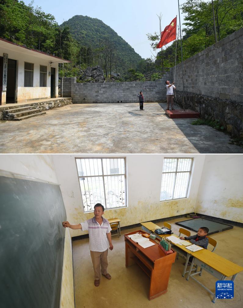 拼版照片:廣西都安瑤族自治縣菁盛鄉義德小學(xué)弄豆教學(xué)點(diǎn)的藍啟飛老師和學(xué)生藍孟源在升國旗(上圖),藍啟飛老師給學(xué)生藍孟源上課(下圖)(2015年4月15日)。義德小學(xué)弄豆教學(xué)點(diǎn)曾有兩個(gè)年級近30名學(xué)生,2015年只剩下藍啟飛老師和學(xué)生藍孟源“一師一生”。工作日,藍啟飛老師要走一個(gè)半小時(shí)的山路來(lái)到這里,為這里唯一的學(xué)生藍孟源上課。