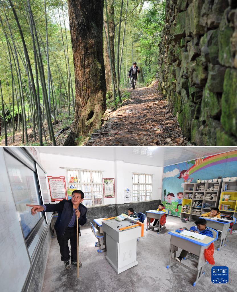 拼版照片:在廣西靈川縣海洋鄉,秦興國走在去中心岐教學(xué)點(diǎn)的路上(上圖,2013年3月27日攝)。秦興國老師在廣西靈川縣海洋鄉安泰教學(xué)點(diǎn)給學(xué)生上課(下圖,2021年10月28日攝)。秦興國是廣西靈川縣海洋鄉一名山區學(xué)校老師,因小兒麻痹癥致右腳殘疾。從教近30年來(lái),他拄著(zhù)拐杖已輾轉海洋鄉4所大山學(xué)校。