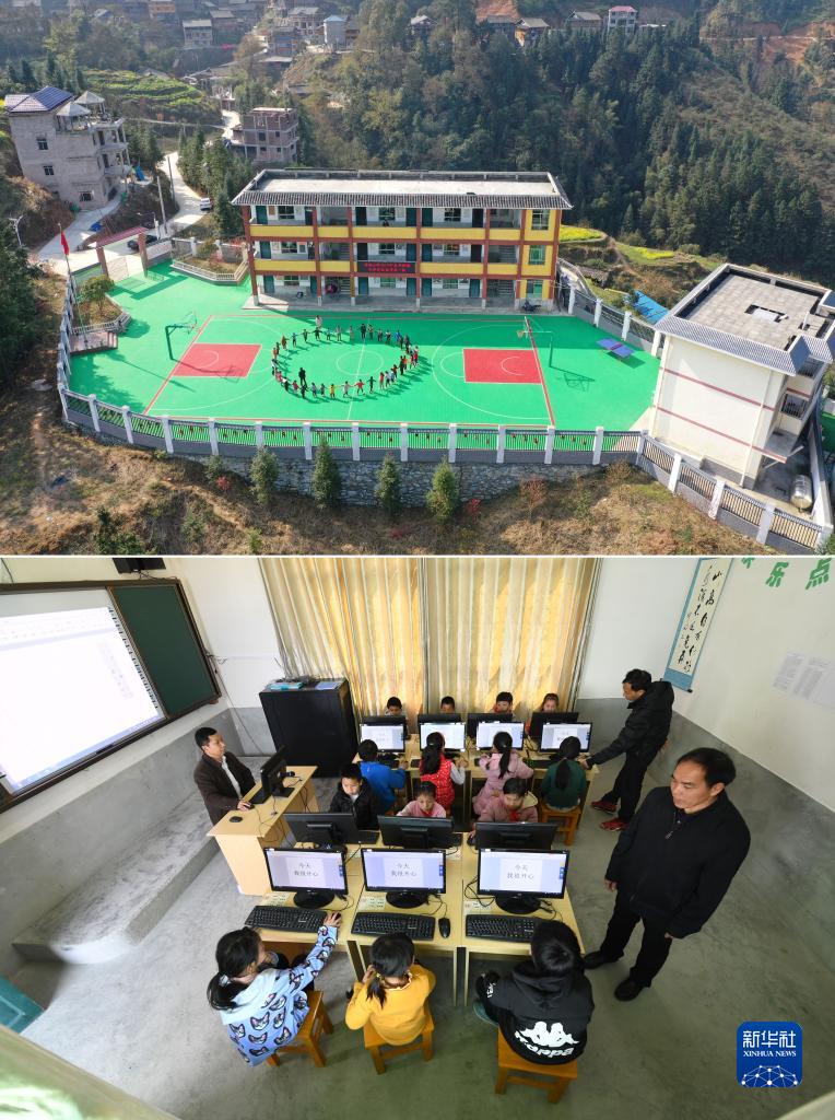 拼版照片:地處黔桂邊界的登曬小學(xué)師生在課間一起做游戲(上圖),登曬小學(xué)老師在給學(xué)生上課(下圖)(2019年3月12日攝)。登曬小學(xué)同屬貴州省黎平縣龍額鎮和廣西壯族自治區三江侗族自治縣富祿苗族鄉,是黔桂共建的一個(gè)教學(xué)點(diǎn),師生有的來(lái)自貴州,有的來(lái)自廣西。1956年建校起,一批又一批老師堅守在這所有“一??鐑墒^、兩省區轄一?!敝Q(chēng)的學(xué)校里。