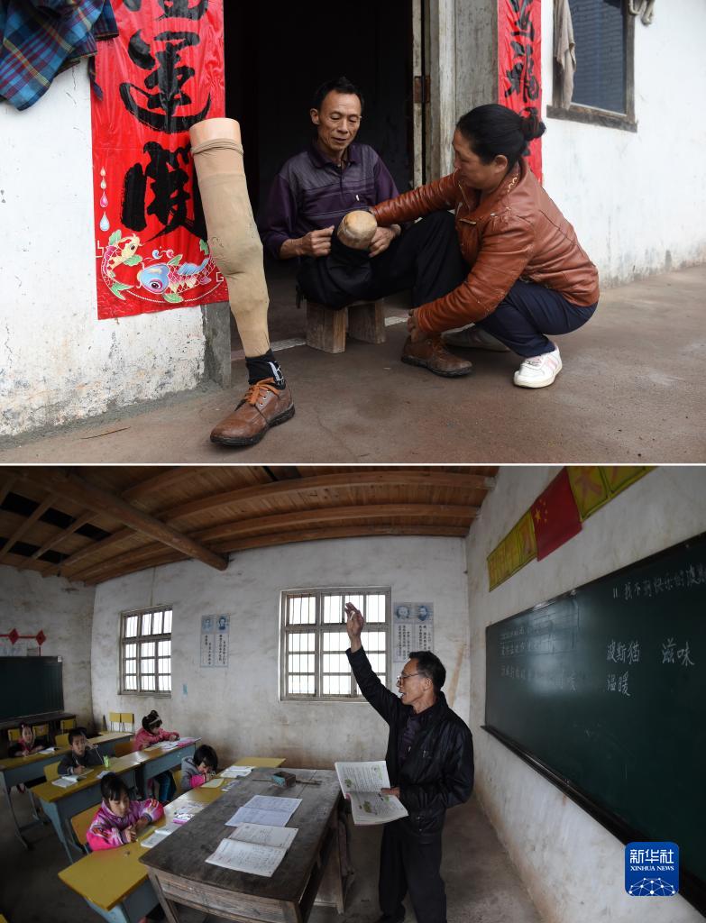 拼版照片:趙德花在野豬殿村的家門(mén)口幫愛(ài)人李祖清老師穿戴假肢(上圖);廣西灌陽(yáng)縣洞井瑤族鄉野豬殿小學(xué)的李祖清老師給學(xué)生上課(下圖)(2016年3月22日攝)。時(shí)年61歲的李祖清老師在1981年家訪(fǎng)途中被毒蛇咬傷致小腿肌肉萎縮、骨骼壞死,成了殘疾人,戴著(zhù)假肢堅守講臺。2015年11月,因暫時(shí)沒(méi)有新老師來(lái)接替他的崗位,他退休后接受返聘重回講臺。